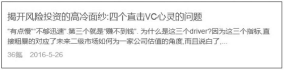 如揭开风险投资的高冷面纱:四个直击VC心灵的问题 (如下图 )—文中,作者将风险投资行业的一些信息进行拆解,并向读者和盘托出,这种"泄密"抓住了读者内心想要了解更多真相的愿望,起到了强大的吸引作用。